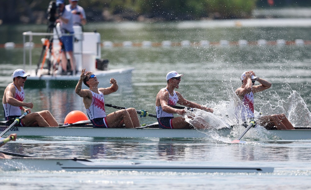 من جانب آخر فازت الولايات المتحدة بالميدالية الذهبية بسباق التجديف بزورق رباعي بدون قائد دفة للرجال، بزمن بلغ خمس دقائق و49 ثانية و3 أجزاء من الثانية بينما حصدت نيوزيلندا الميدالية الفضية بعدما أنهت السباق في زمن بلغ خمس دقائق و49 ثانية و88 جزءًا من الثانية، فيما حصلت بريطانيا على الميدالية البرونزية بعدما أنهت السباق في زمن بلغ خمس دقائق و52 ثانية و42 جزءًا من الثانية.